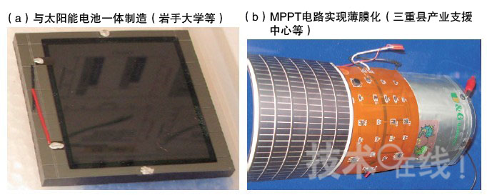 (b)为三重县产业支援中心等的开发示例,与太阳能面板、最大功率点跟踪(MPPT)电路,以及锂聚合物充电电池进行了组合。