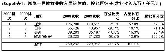 表1所示为iSuppli公司对2009年各地区半导体营业收入的最终估计。