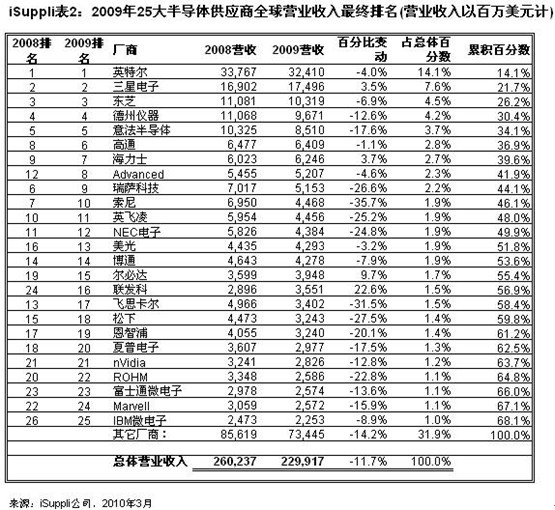 表2所示为iSuppli公司对2009年全球半导体厂商营业收入的最终排名。