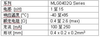 该产品实现了贴片元件的最小尺寸,仅为0402(0.4×0.2×0.2mm)?;闶钡奈恢每刂?,使用了目前最高精度的新技术。为了提高Q特性,通过优化线圈的形状设计使其达到最理想状态,实现了与以往的产品相比,Q特性提高40%。特别用于高频电路中,高Q特性可以减少损耗,发挥其高效率。在抗阻(0.4~2.6ohm max),额定电流(100~250mA),电感系数(1~15nH)范围之内,该产品的line-up具备了E12系列的15种,并计划于2010年5月追加E24系列的12种。