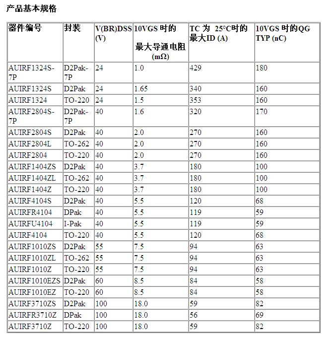 国际整流器公司 (International Rectifier,简称IR) 推出首款汽车专用 MOSFET 系列,适用于需要低导通电阻的各种应用,包括电动助力转向系统 (EPS) 、集成式起动发电机 (ISA) 泵和电机控制、DC-DC 转换、电池开关,以及内燃机 (ICE) 和混合动力汽车平台的其它重载应用。