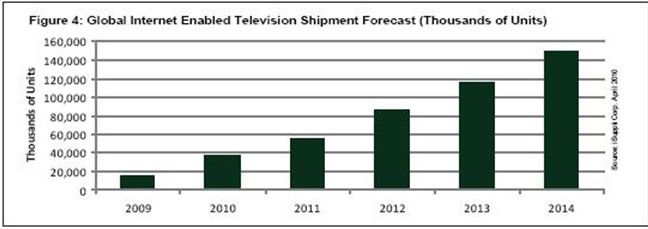 同样,随着品牌厂商努力延缓价格下跌速度和吸引消费者来更换其原有的老式平板电视,未来几年对于IETV的推广活动将会增强。iSuppli公司预测,2014年IETV市场将从2009年的1470万台增长到1.49亿台,复合年度增长率为58.9%。