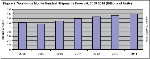 考虑到手机市场在2009年第四季度回升,以及欧洲、拉美和中东/非洲地区第四季度表现出色,可以说手机产业已经正式结束衰退。iSuppli公司认为,今年整体手机出货量继续增长——预计增长11.3%至13亿部,进一步支持上述看法。
