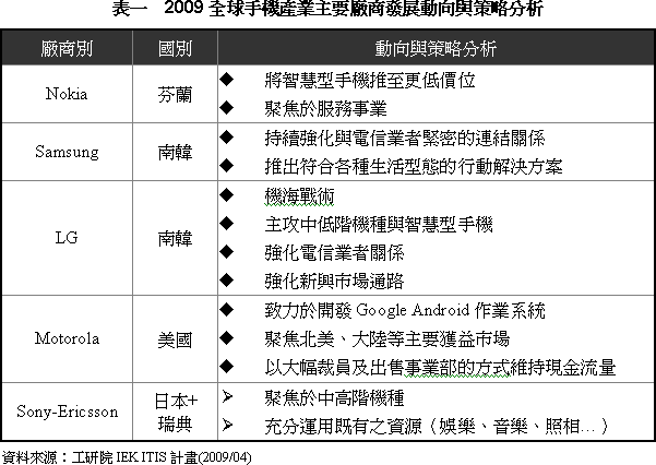 受金融风暴影响,2009年全球手机市场衰退已成定局,为了因应诡谲多变的局势,前五大手机品牌业者纷纷调整其市场策略,Nokia以完整布局求稳定发展,Motorola与Sony-Ercisson则主要以撙节开销的方式熬过寒冬,相较之下韩系业者则以较为积极的方式进行布局。