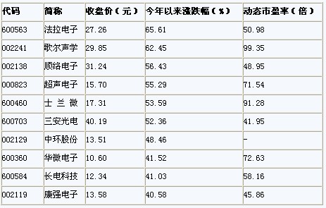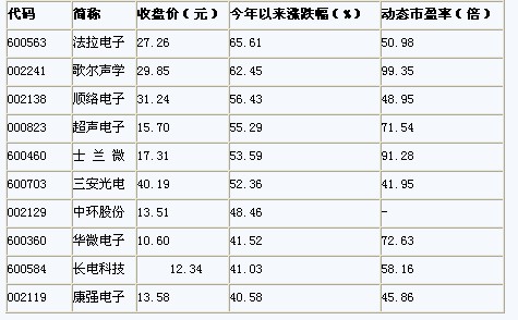 二级市场的表现一向来都是先于上市公司的经营情况的。今年以来许多电子类公司就出现了不同程度的上涨,该行业的今年以来算术平均涨幅达20.6%。其中今年以来涨幅最大的是法拉电子,上涨达65.61%。其次是歌尔声学,上涨幅度达62.45%。特别注意的是随着一季度业绩的公布,这些大幅上涨的个股,由于净利润的同时上涨,PE也并未明显增高。