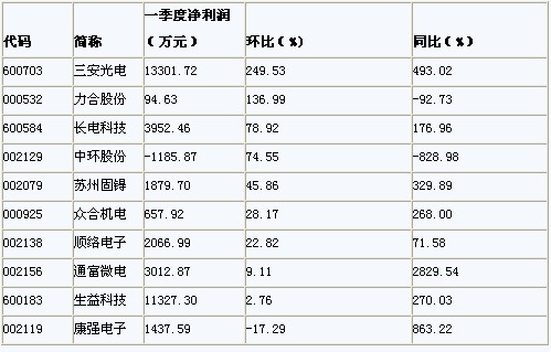 另外从电子类上市公司的已公布一季度报告的上市公司来看,三安光电、力合股份、长电科技分列净利润环比上涨前三位。其中三安光电和长电科技分别受益于国家新兴产业政策中的LED和手机支付。三安光电是国内规模最大的全色系超高亮度LED芯片生产企业,而长电科技是国内半导体封装的龙头企业。在国家不断推出支持新兴产业发展的政策大背景下,电子行业的景气度还将继续维持在高位。
