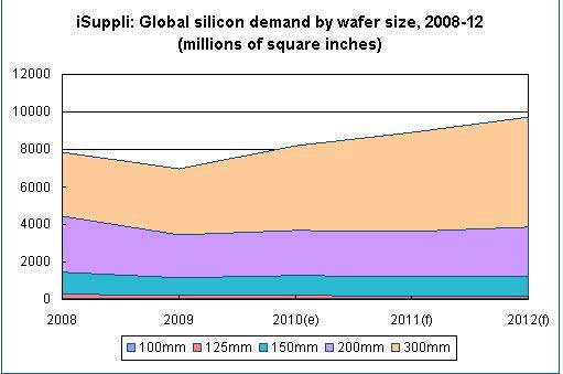 iSuppli:2008年至2012年,全球不同尺寸半导体硅片市场需求量状况