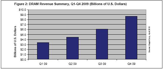 2009年第一季度创下2001年以来的最低营业收入,DRAM产业随后持续稳步改善,第四季度营业收入达到87亿美元,比第三季度的61亿美元劲增43%。这样的结果足以使2009年第四季度成为过去10年来DRAM市场表现最好的五个季度之一。