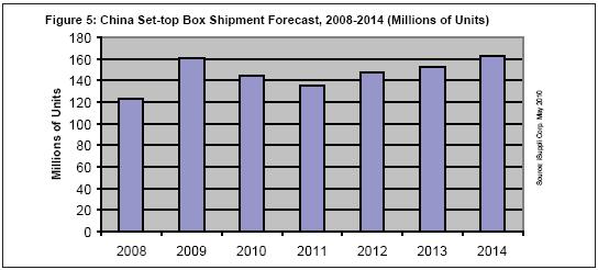 2009年中国总体机顶盒出货量达到1.605亿台,比2008年的1.234亿大增30%。iSuppli公司的图表显示,这些数据证明中国已成为全球最大的机顶盒生产国,以及领先的机顶盒设计中心。