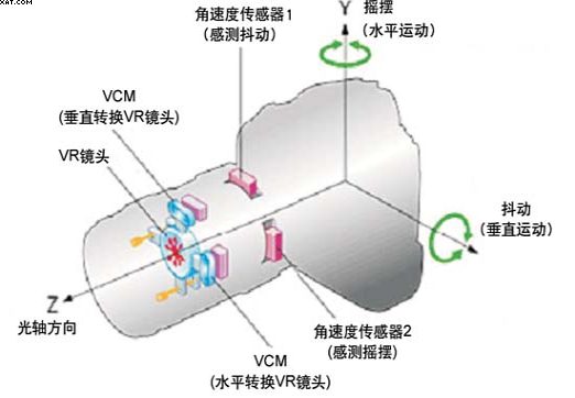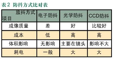 镜头防抖是通过镜片的移动来补偿相机的抖动,它由传感器,微处理器,补偿镜片控制组,驱动控制部分组成,依靠补偿镜片的移动来校正手抖引起的光线偏移,如图1,镜头不同,设计上有差异,但基本上都是透过补偿镜片组来补偿。CCD防抖是通过感光元器件CCD(或CMOS)放在一个可移动支架上来,通过传感器感知相机的抖动,由微处理器计算相应的移动量,由驱动部分对CCD移动,以达到防抖目的。目前,一般相机的防抖(CCD防抖或光学防抖)不是无限可以补偿,一般为2~~3级,按表一来说,假设安全快门1/125,2级,快门速度1/30,快于此速度,容易拍清晰的照片,由此类推,3级,快门速度为1/15。表2为三种防抖方式的比对表。