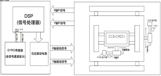 由图2看出,在3D图面上,Z轴有自动聚焦功能,Z轴移动对成像基本没有影响,有影响是在X轴(PITCH)与Y轴(YAW)。图4为在晚上拍照,无防手抖与有CCD防手抖的结果。图5为CCD防抖系统框架,CCD防抖是在镜头上增加CCD支架,利用步进马达对X轴,Y轴的驱动,使CCD移动来补偿CCD的抖动。MEMS陀螺仪选用要有X,Y轴Gyro芯片,内部含放大,低通,高通滤波,这样可以大大减少相机的尺寸。Gyro信号连DSP的ADport,DSP的AD是10bit,满足设计要求。资料运算用相机本身的DSP处理,可以减少一微处理器(Micro),降低成本。DSP对Gyro传来的ω信息进行运算,计算补偿量,通过马达驱动电路驱动X,Y移动来达到补偿的目的。X轴,Y轴的PI信号是Lens反馈DSP信息来校正CCD与Lens中心重合,避免补偿过程超出Lens设计的补偿范围。