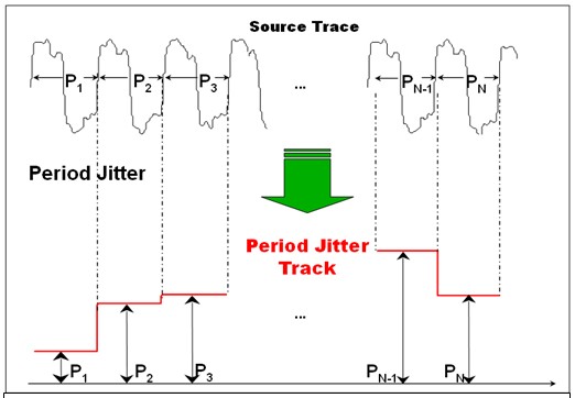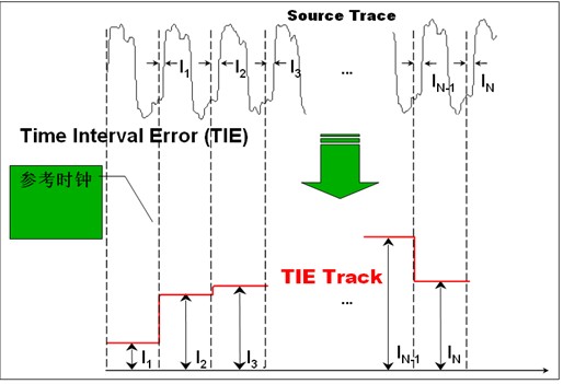 在图2、图3、图4中的红色曲线横轴是时间,纵轴是对应周期的抖动数值,该曲线反映了抖动随时间变化的趋势,称为抖动跟踪(Jitter track);将每个周期的抖动值(比如TIE抖动的I1、I2…In)作统计直方图,可以得到抖动直方图(Jitter Histogram);将抖动跟踪做快速傅立叶变换(FFT)计算可以得到抖动频谱(Jitter Spectrum)。