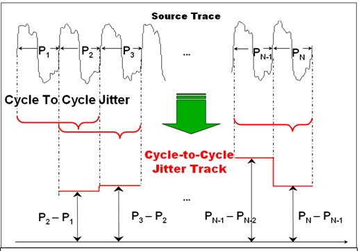 相邻周期抖动(Cycle to cycle jitter)是时钟相邻周期的周期差值进行统计与测量的结果。如图4所示,后一时钟周期减去前一时钟后作为统计的样本,C1=P2-P1, C2=P3-P2, Cn-1 = Pn - Pn-1,把C1到Cn-1进行数理统计,同理,可以计算出Cycle to cycle jitter的峰峰值和RMS值。