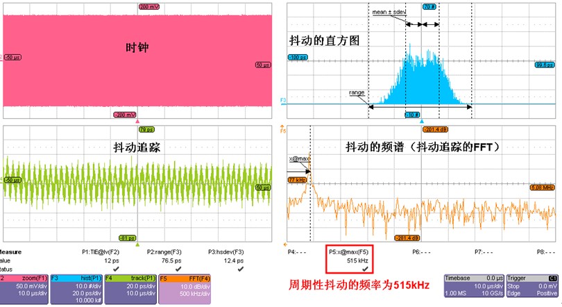 左下角的F4为TIE track(即TIE抖动随时间变化的趋势),从TIE Track中可以看到周期性的变化趋势;右下角的F5是F4的FFT运算,即抖动的频谱,频谱的峰值频率为515kHz,说明该时钟的周期性抖动(PJ)的主要来源为515kHz,找到频点后,可以查找电路板上主频或谐波为该频率的芯片和PCB走线,进一步调试与分析。时钟抖动的分解