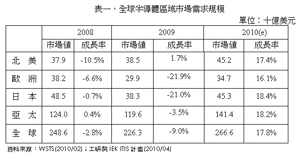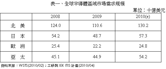 2009年各地区产值皆较2008年衰退。其中,以欧洲地区衰退幅度最大。其最大原因在于Qimonda退出记忆体产业所致。预计2010年在全球景气复苏下,半导体景气也将在2010年呈现正成长力道。 2010年亚太地区受惠于中国大陆等新兴市场内需持续强劲、政府刺激内需政策之支持、IDM大厂为降低成本持续释单至亚太地区,以及记忆体产业景气大幅回升下,预期产值成长幅度将较其他地区来得高。2010年各地区产值年成长率预估值为:北美地区17.7%,日本地区17.7%,欧洲地区11.7%,亚太地区20.7%。