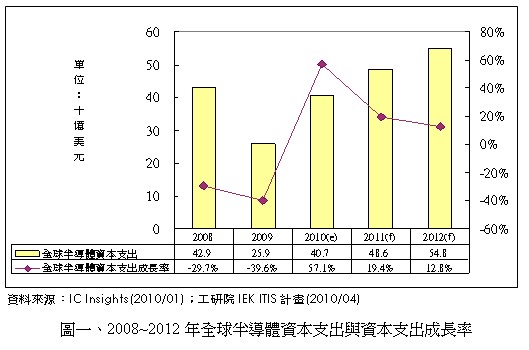 金融风暴使得全球厂商皆大幅减少资本支出金额,以保存手中之现金,度过此波不景气。 2009年全球半导体资本支出为259亿美元,较2008年429亿衰退39.6%。然而,在看好今年欧美主要消费市场需求之复苏,以及新兴市场需求力道可望持续下,2010年全球半导体厂商将提高资本支出达407亿美元规模,较2009年大幅成长57.1%。其中,全球记忆体厂商大幅提高资本支出,以提升其先进制程水准,是主要动力之一。