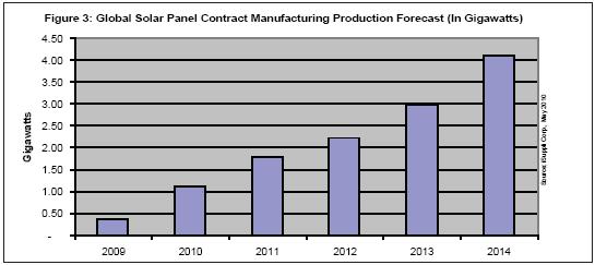 2010年合同制造商将生产1.1GW的太阳能电池板,比2009年时的369MW大增200%。其余的生产任务将由专门的太阳能电池板厂商以及其它企业承担。2014年合同制造商生产的太阳能电池板将比2010年增长近三倍,达到4.1GW。