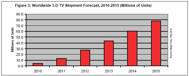 3D电视3月首次上市,由于日益受到欢迎以及早期接受者的接纳,预计2010年全球出货量将达到420万台。2011年全球3D电视出货量将是今年的三倍,达到1290万台,2012年再增长一倍达到2740万台。