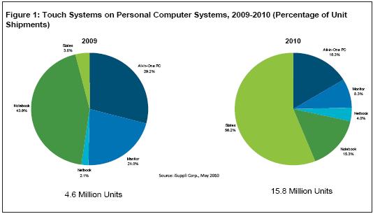 最近几年,个人电脑市场对于触摸屏的需求不断增长,2008和2009年增长率超过20%,快于总体系统市场。但与该市场2010年462%的增长率相比,上述增长速度就相形见绌了。平板触摸电脑是PC触摸革命中的主要初期推动者,预计占PC触摸市场的比例将从2009年的3.8%锐升到56.2%,而总体PC触摸市场规模将扩大两倍。