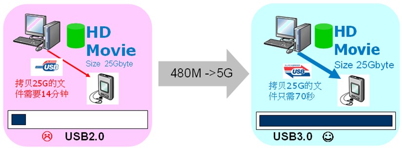 尽管USB2.0的速度已经相当快,对于目前高清视频和TB级别的数据传输还是有些慢,在2008年11月,HP、Intel、微软、NEC、ST-NXP、TI联合起来正式发布了USB3.0的V1.0规范。USB3.0又称为Super Speed USB,比特率高达5Gbps,相比目前USB2.0的480Mbps的速率,提高了10倍以上,引用Intel专家Jeff Ravencraft的话:“以25GB的文件传输为例,USB2.0需要14分钟,而3.0只需70秒左右(如图1所示)。”25GB,正好是单面单层蓝光光盘的容量。USB3.0预计将在2011年逐渐在计算机和消费电子产品上使用。