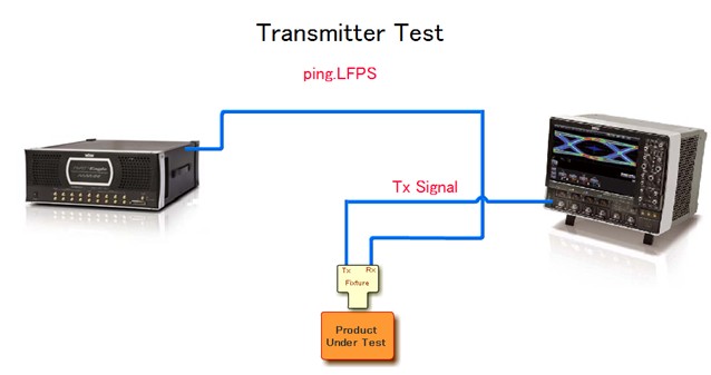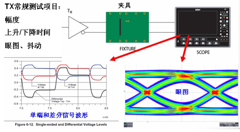 对于绝大多数高速串行信号的测量,通常包括了发送端测量和接收机测量,又称为TX测量和RX测量。目前,对于板级设计的硬件工程师,对发送端测试已经非常熟悉。通常使用高带宽示波器加上测试夹具或差分探头来测量,测试项目主要是眼图、抖动、上升/下降时间、幅度等等,探测点的位置一般是串行链路的发送端或接收端,由于测量的都是高速收发器芯片发送出的信号,对于这一类测试通常都称为发送端测试,如下图2为典型的TX测试的示意图。