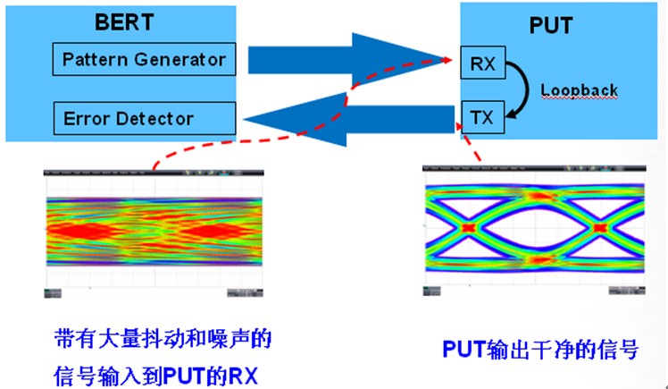 图3为接收机测试的示意图。接收机测试所需的仪器是误码率测试仪(简称BERT),BERT通常包括码型发生器(Pattern Generator)和误码检测器(Error Detector)两部分。在接收机测试时,码型发生器输出特定码型的、带有大量抖动和噪声的信号到待测试产品(Product Under Test,简称PUT)的RX,PUT接收到后通过时钟与数据恢复电路(简称CDR)、判别电路和解码得到1和0组合的比特流,然后环回到输出寄存器,从PUT的TX缓冲器发送出去,PUT的TX连接到了BERT的误码检测器,误码检测器中的CDR、判别电路处理后解码得到1与0组合的数据比特流,然后与码型发生器输出的特定码型数据对比,如果两者完全吻合则没有误码,否则,记录下误码的数量和接收到的码流的比特总数,前者除以后者即误码率,同时记录接收到误码时码型发生器输出信号的抖动值。如果用示波器测量PUT的RX端接收到的信号的眼图,通常是闭合的,如图3的左下图所示;如果用示波器测量PUT的TX端输出信号的眼图,通常是良好的眼图,如图3右下图所示。修改码型发生器输出信号的随机抖动、固有抖动、信号幅度等参数,可以快速评估PUT的接收机性能。