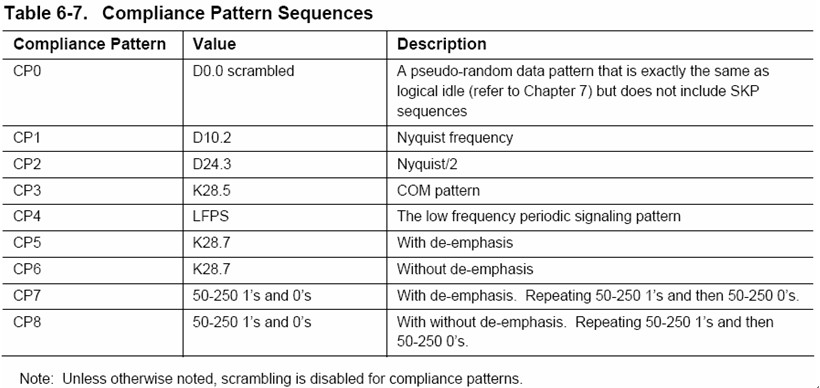 在USB3.0规范中定义了多种兼容性测试码型(Compliance Pattern,简称CP),如下图4所示包括了CP0-CP8九种测试码型。在TX测量中,需要用到CP0/CP1/CP7/CP8四种码型:CP0用于眼图与抖动、共模电压测量;CP1用于SSC展频测量、随机抖动测量;CP7用于去加重测量;CP8用于差分电压幅度测量。