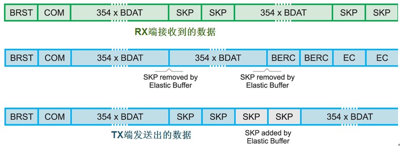 在USB3.0中,链路两端的产品的参考时钟频率可能是不一样的,参考时钟允许的精度为+/-300ppm,SSC展频引入的频率偏差为0到-5000ppm,所以总的频率偏差在-5300ppm到300ppm。为了补偿频率偏差,在USB3中的数据流中每354个symbol要插入两个SKP(即K28.1码),接收端需要能识别和删除SKP,在USB3.0芯片中,添加和删除SKP是由Elasticity Buffer来实现的(详见USB3.0 Specification的6.4.3节)。于是,在接收机测试时,PUT发送出的码流会加入一些SKP,误码检测器接收到的数据包括了测试码型和一些SKP,然后对比码型发生器发送出的测试码型,传统的BERT会误认为测量到了误码。而力科的PeRT可以智能的添加和删除SKP后,再来计算是否有误码。图6为USB3.0的Elasticity Buffer处理SKP的示意图。