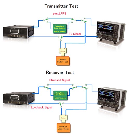 在TX测试时,信号的传输链路如图7的上半部分所示,力科示波器通过USB电缆控制PeRT3,PeRT3通过同轴电缆向PUT的RX端发送Ping.LFPS,PUT的TX连接到示波器的通道。PeRT每发送一次Ping.LFPS,则PUT的TX发送的码型在CP0到CP8之间切换一次(比如从CP0变为CP1,或从CP8变为CP0),这样无需测试人员去配置PUT发送不同的测试码型了,通过PeRT3,力科的QualiPHY软件会自动控制PUT发送不同的测试码型,完成TX的所有测试。
