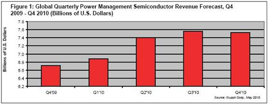 2010年第一季度,电源管理半导体销售收入达到69亿美元,比2009年第四季度的67亿美元增长2.9%。该市场在2009年第三季度曾陷入停滞,第四季度开始扩张,第一季度数据显示该市场仍在扩张。