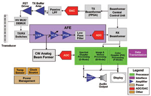 超声波系统的接收路径方面,使用了一种模拟方法。因为接收信号的振幅远低于发送信号,因此前端包括一个低噪声放大器,其后为某种增益控制模块。滤出非相关高频部分以后,得到的信号通过一个模数转换器(ADC)转换为数字形式,而该模数转换器的输出则由波束形成器来处理。