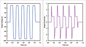 图2±100V电源时典型的超声波发送器输出,以及流入100Ω和300pF并行负载的相应瞬时电流