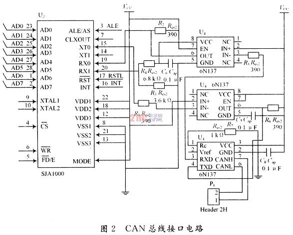 选用芯片82C250作为CAN控制器和物理总线间的驱动接口,可以提供对总线的差动发送能力和对CAN控制器的差动接收能力,其最高速可达1Mb/s。由于实际系统中存在干扰,故增加高速光隔6N137,以起到隔离的作用。电气接口很简单,有CANH和CANL两根线,用以完成CAN的数据传输。在CAN总线的两端有一个120Ω的电阻,其作用为匹配总线阻抗,用于提高数据通信的抗干扰性及可靠性。具体电路如图2所示。