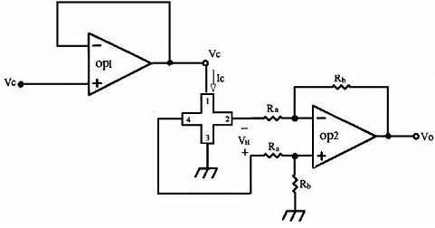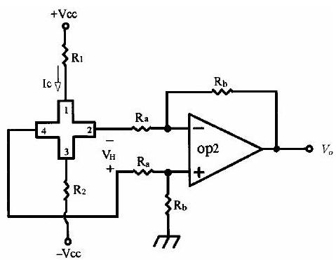 磁场强度可利用形成在结晶片的一部份的霍尔组件变换成电气信号(参照前述霍尔组件的作用原理)。结晶通常使用半导体硅,霍尔组件的磁场灵敏度为10~20mV/K.Oe。此信号经形成在同一结晶中的信号处理电路放大后,作为适合所定目的的信号电压被取出。通常四根导线中的两根连接于一方接地的电源,而从剩下的两根的一根取出正极性的信号电压,并从另一根取出负极性的信号电压?;舳榧氖淙氲缱柰ǔP璺闲藕糯淼缏返牡缭?,以便可利用定电压使用霍尔组件。此时组件的输出电压不管在N型或P型均无大差异。又因输出电压与电子或正孔的移动度成正比,故温度特性也应该尽量保持一定,这是与单体霍尔组件不同的地方。