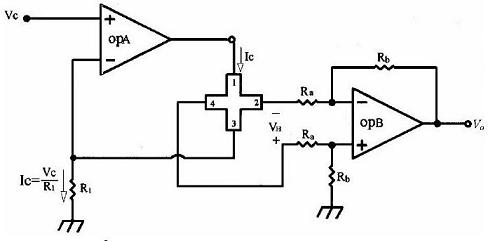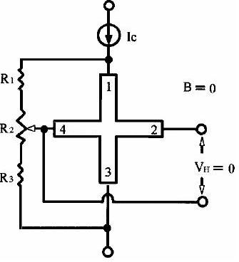 图2系表示3~5端子之霍尔组件的使用方法,在三端子霍尔元件之输出可以产生输入端子电压之大致一半与输出信号电压之和的电压,而在四端子及五端子霍尔组件中,在原理上虽然可以免除输入端子电压的影响,但实际上即使在无磁场时,也有起因于组件形状之不平衡等因素之不平衡电压存在。