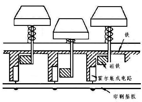 霍尔集成电路通常使用于前述磁电变换组件的项所述的(A-1)、(A-2)范围的用途,在这些用途的中,特别像开关那样,以磁气为媒介将位置的变化、速度、回转等的物理量变换为电气量时,使用起来非常简单。使用霍尔集成电路的开关系如图2-21所示,这种开关具有:(1)无震动(Chattering),(2)不生杂音,(3)使用寿命长,可靠度高,(4)响应速度快等特征,已经实际被使用作为高级的键盘用开关。