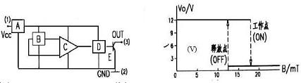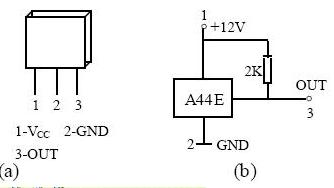 图11是A44E集成霍耳开关,A44E集成霍耳开关由稳压器A、霍耳电势发生器(即硅霍耳片)(mT)、差分放大器C、施密特触发器D和OC门输出E五个基本部分组成,如图12(a)所示。(1)、(2)、(3)代表集成霍耳开关的三个引出端点。在输入端输入电压VCC,经稳压器稳压后加在霍耳电势发生器的两端,根据霍耳效应原理,当霍耳片处在磁场中时,在垂直于磁场的方向通以电流,则与这二者相垂直的方向上将会产生霍耳电势差HV输出,该HV信号经放大器放大后送至施密特触发器整形,使其成为方波输送到OC门输出。