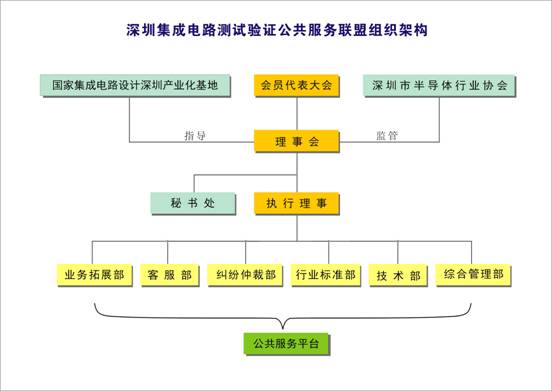 如上图所示,会员代表大会由IC设计公司,封装测试厂,设备厂商,高校,研究所和电子制造工厂代表组成,是深圳集成电路测试验证公共服务联盟的最高权力机构,下设理事会,理事会是联盟管理的智囊团,各种规章制度的起草者和重大事务的决策者,其下又设执行理事和秘书处,执行理事负责日常事务的实际运行,是公共服务联盟的操作单位,秘书处主要负责会员代表大会的召开以及日?;嵩笔乱说淖橹?,执行理事又下设业务拓展部、客服部、纠纷仲裁部、行业标准部、技术部和综合管理部。