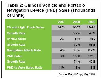 表2所示为iSuppli公司对2007-2009年中国市场PND销量以及汽车销量的估计。