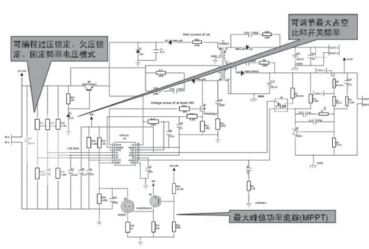 在应用中,通过在ISET引脚动态调节电流限制,从而实现最大峰值功率追踪功能。一旦输入电压逐脉冲下降,电流限制就会被降低,直至输入电压恢复。这种方式无需使用价格昂贵的微控制器。这样实现的充电控制器会发现峰值功率点并进行动态调节,使其符合不断变化的电源特性。实际上,通过采用最大峰值功率追踪技术,可以将较以往多30%的电荷从太阳能板传输至蓄电池,这样太阳能街灯系统就可以采用尺寸更小的太阳能板,从而带来显著的成本效益。图1是采用安森美半导体CS51221控制器的太阳能板充电控制应用示意图。