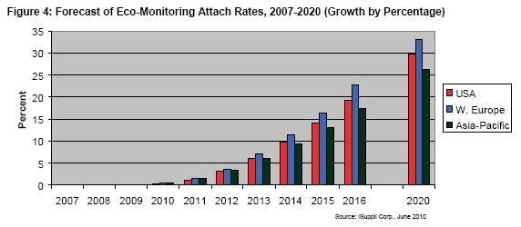 上述每类应用的汽车配售率预计都会增长,2010-2013年增长比较缓慢,随后从2014年开始基本以两位数的速度增长,直到2020年末。iSuppli公司的图表显示,节能监测和节能建议近期将大幅增长,而由于复杂性和需要与其它汽车系统整合,节能动力总成的布署比较缓慢。但到2020年,美国和西欧的节能动力总成应用将达到35%的配售率,接近节能监测和节能建议系统的水平。