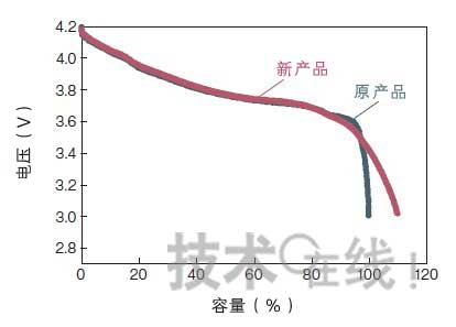放电曲线与原来相同 新产品的最大特点是,具有与原有锂离子充电电池几乎相同的放电曲线,并且实现了高容量化(图1)。由于充电电压和工作电压与原来的锂离子充电电池相同,因此产品厂商无需改变产品的电源系统即可利用。