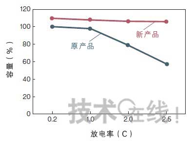 新产品不但容量大,大电流下的充放电特性也十分出色。充电时间可比原产品缩短约30%。放电方面,即使在2.5C的放电率下容量也不会降低,可用于高输出产品(图2)注1)。