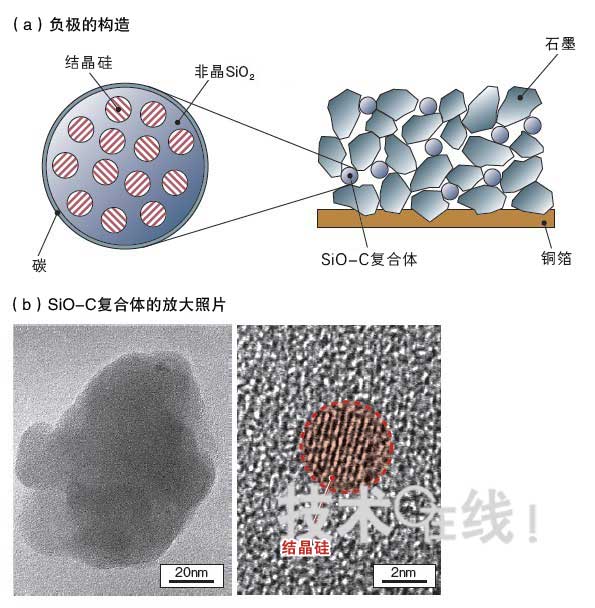 负极采用日立麦克赛尔量产的硅类材料的单元混合了SiO-C复合体和石墨(a)。SiO-C将nm级的硅分散到非晶SiO2的构造体内(b)。图由本站根据日立麦克赛尔的资料制作。