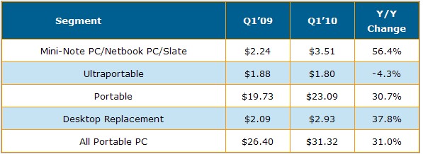 2010年第一季笔记本电脑出货金额增长主要来自于上网本/平板计算机及可携式电脑领域。上网本与平板电脑主要增长源于拉丁美洲与亚太地区跳跃性成长,以及中国与北美的持续增长;而可携式电脑在亚太地区、中国与拉丁美洲出货较2009年增长许多,同时使得可携式电脑应用领域年成长率高于所有种类出货平均。另以取代台式电脑为主的笔记本电脑在欧洲、中东及非洲(EMEA)与日本的无论是出货量或出货金额均取得了一定的增长。
