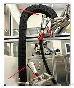 对于洁净室环境来说,电缆拖链中的电缆集尘是一个复杂的问题。为了尽量减少集尘,需要尽可能地避免电缆以及套管之间的摩擦。尽管通过减少运动器件可以减少集尘,但是自动生产线上电缆的运动不可避免。另外,用于分隔圆形电缆和套管的分隔片和支架是产生集尘的另一个因素。如果不使用分隔片,或者分隔片没有正确的安装,电缆以及套管之间的摩擦将导致这些部件的蠕变、移动或扭曲,这样就会增加集尘。