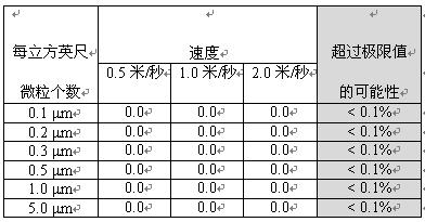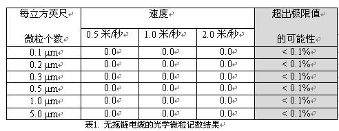 光学微粒记数器记录了无拖链电缆(见表1)和装有高柔性扁平电缆的电缆拖链A在每个测量点产生0个微粒(见表2)。按照VDIGuideline2083和ISO14644-1标准的集尘可能性的计算方法,测定这些电缆在上述测试速度的集尘可能性低于0.1%。