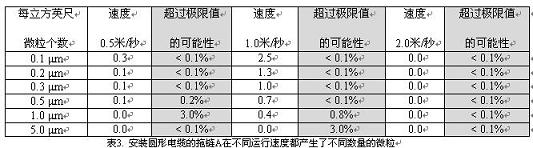 安装圆形电缆的拖链A在不同运行速度都产生了不同数量的微粒(见表3)。按照VDIGuideline2083和ISO14644-1标准,鉴定这种电缆拖链/电缆装置产生集尘的可能性是3%。