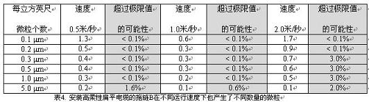 安装高柔性扁平电缆的拖链B在不同运行速度下也产生了不同数量的微粒(见表4)。按照VDIGuideline2083和ISO14644-1标准,鉴定这种电缆拖链装置产生集尘的可能性是3%。