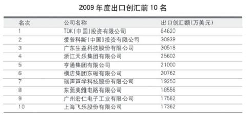 本届元件百强企业中,97家企业有出口业务,其中53家企业的出口下滑,有15家企业的出口下降程度在30%以上。出口总额超过1000万美元的企业达到68家,比上届少1家;出口总额超过5000万美元的企业有25家,也比上届少1家。但是,有16家企业2009年的出口额超过了1亿美元,比上届多1家。